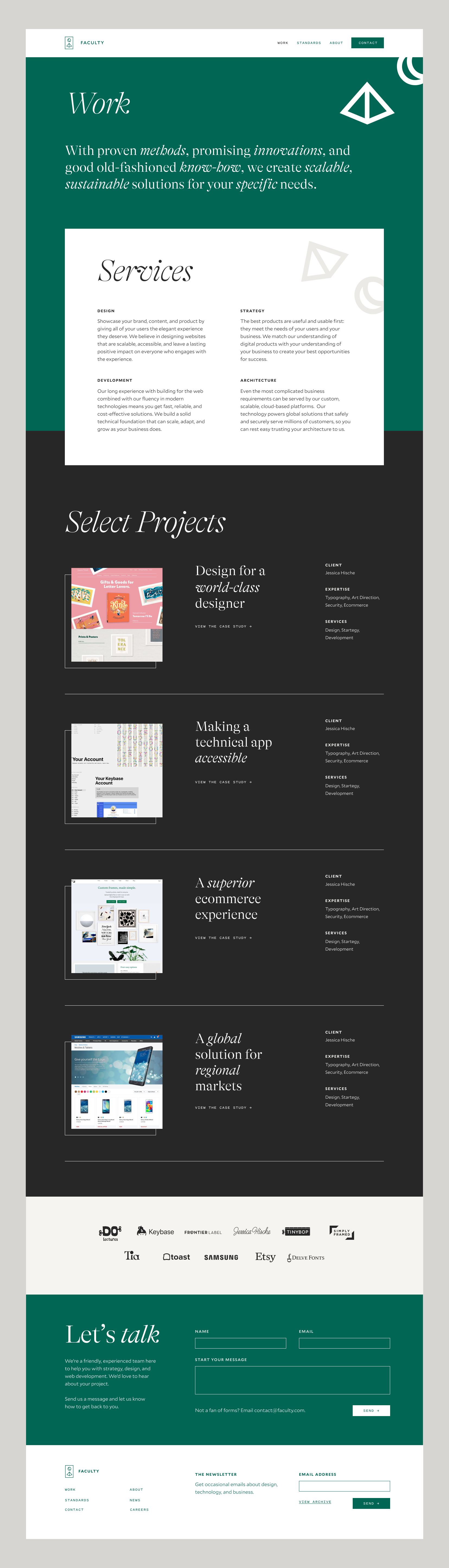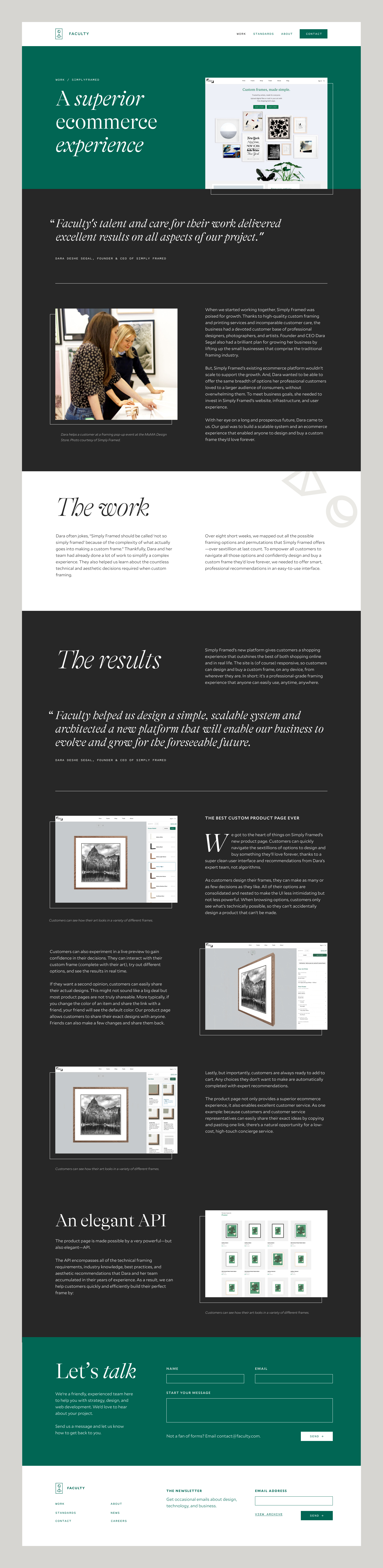 Part of my role as the Principal Designer at Faculty entailed redesigning our own website. Using existing branding elements such as our logo, color palette, and some font styles, I created a new website concept that was more dynamic, sophisticated, and engaging.